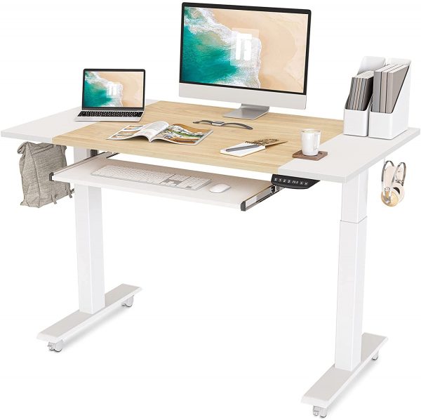 BONZAY Dual Motor Height Adjustable Electric Standing Desk, 48 x 24 Inch Full Sit Stand Home Office Table with Splice Board, White Frame/White and Natural Top